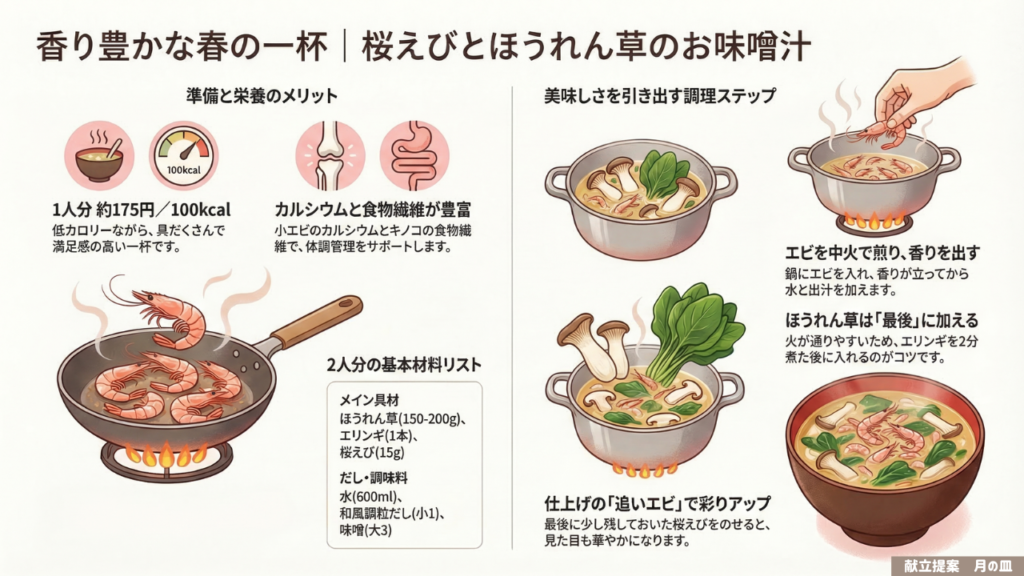 みなさんこんにちは。今日は、春の香りがふんわり漂う「桜えびとほうれん草のお味噌汁」をご紹介します。