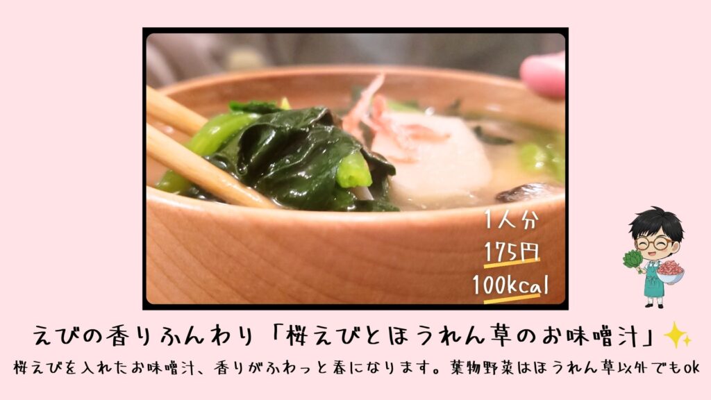 みなさんこんにちは。今日は、春の香りがふんわり漂う「桜えびとほうれん草のお味噌汁」をご紹介します。